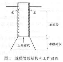 在離心力和重力的作用下,旋轉(zhuǎn)水流于旋膜管的出口形成張開的水膜裙。由于水膜裙自上而 下運(yùn)動(dòng),加熱蒸汽自下而上運(yùn)動(dòng),強(qiáng)化了水膜裙的波動(dòng),使水膜裙迅速進(jìn)入紊流狀態(tài),增強(qiáng)了加熱蒸汽的凝結(jié)放熱。旋膜管的結(jié)構(gòu)和工作過程如圖1。