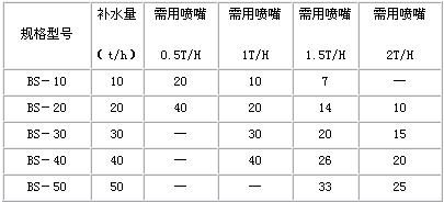 型號選配。根據(jù)需要和可能我公司有四種規(guī)格噴嘴即每只噴嘴流量為0.5T/H、1T/H、1.5T/H、2T/H組裝成的補(bǔ)水節(jié)能裝置,具體規(guī)格型號如下: