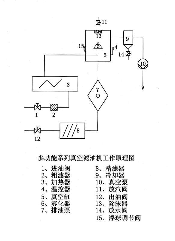 開動真空泵系統(tǒng),真空表的負壓達到-0、06Mpa時可以打開進油閥(1),待凈化油液從主油箱進入粗濾器(2),經(jīng)過粗濾器除去油中的較大水顆粒和雜質(zhì)。粗凈化的油進入加熱器(3),加熱后的油液進入真空缸(5),再通過霧化器(6),在一定的溫度和真空條件下、油水充分霧化、水份蒸發(fā)向上、油液降下、油中所含的水份和氣體霧化后被真空泵抽出。進入冷卻器(9),通過冷卻的蒸汽,部分被冷卻成水,部分未冷卻成水,但降溫后被真空泵(10)抽出,從排氣口排出。時刻要觀察真空缸的油位,當油位達到觀察孔中心時,可以將排油的主令開關(guān)旋至自動上即可,當真空缸油達到高油位時,排油泵自動排油,當油位達到低油位時自動停泵?扛∮驼{(diào)節(jié)閥(15)控制排油泵,排油泵將油液從真空缸打入精濾器(8)除去微粒雜質(zhì)后排入主油箱,排油時必須提前打開排油閥(12)。