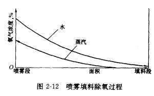 旋膜除氧器往往是噴霧再加某種形式填料的除氧器,是由上下兩段用不同加熱元件加熱的除氧段組合而成。上部除氧室是噴霧段,下部是某種填料段。前述那些單純一段式除氧器,即由一種傳熱、傳質(zhì)元件組成的除氧器,往往難以達(dá)到最深度的除氧,即殘余含氧量接近于零的除氧效果。例如噴霧式除氧器,它的優(yōu)點(diǎn)在于噴散成的液滴,水很微細(xì),傳熱、傳質(zhì)面積大,從而使加熱效果好,能達(dá)到90%的溫升,能除去約60%~80%的氧氣,但是由于水滴停留的時(shí)間太噴霧段面積填科段短,僅為0.15~0.2s左右,由于水的表面張圖2-12噴霧填料除氧過(guò)程力等的作用,在這樣短的時(shí)間內(nèi)氧氣難以全