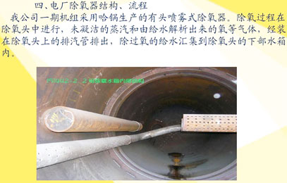 電廠除氧器結(jié)構(gòu)、流程我公司一期機(jī)組采用哈鍋生產(chǎn)的有頭噴霧式除氧器。除氧過程在除氧頭中進(jìn)行,未凝潔的蒸汽和由給水解析出來的氧等氣體,經(jīng)裝在除氧頭上的排汽管排出,除過氧的給水匯集到除氧頭的下部水箱內(nèi)。