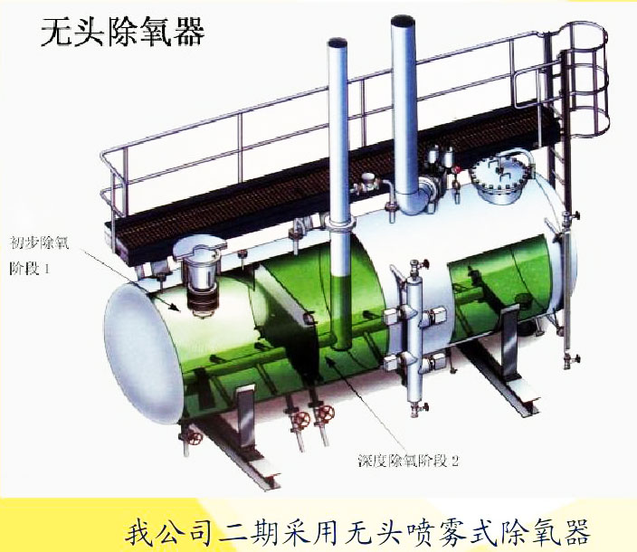 無頭除氧器 我公司二期采用無頭噴霧式除氧器凝結(jié)水從盤式恒速噴嘴噴入除氧器汽空間,噴水孔的多少由彈簧控制,噴水粒度與角度不受負(fù)荷影響,小水滴撞到擋水板后進(jìn)入水空間流向出水口;加熱蒸汽排管沿除氧器筒體軸向均布,加熱蒸汽通過排管從水下送入除氧器,加熱蒸汽與水混合加熱,使其達(dá)到飽和狀態(tài),同時對水流進(jìn)行擾動,將水中的溶解氧及其它不凝結(jié)氣體從水中帶出水面,達(dá)到對凝結(jié)水進(jìn)行深度除氧的目的;水在除氧器中的流程越長,則對水進(jìn)行深度除氧的效果越好,為了延長給水流動時間,不凝結(jié)氣體能充分析出,在水空間內(nèi)有隔板。未凝結(jié)的加熱蒸汽(此時為飽和蒸汽)攜帶不凝結(jié)氣體逸出水面流向噴嘴的排汽區(qū)域(噴嘴周圍排汽區(qū)域?yàn)槲达柡退畤婌F區(qū)),在此區(qū)域未凝結(jié)的加熱蒸汽凝結(jié)為水、不凝結(jié)氣體則從排氣口排出。