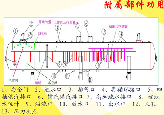 1、安全門2、進(jìn)水口3、排氣口4、再循環(huán)接口5、四抽供汽接口6、 輔汽供汽接口7、高加疏水接口8、 就地水位計9、 溢流口10、放水口11、 出水口12、人孔13、壓力測點(diǎn)